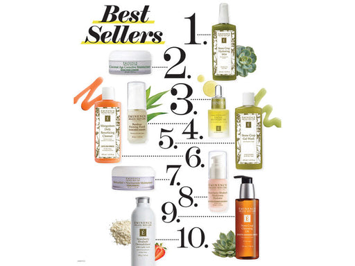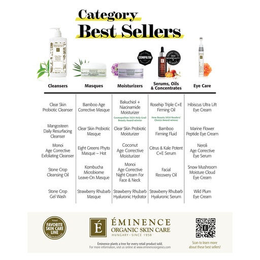 Full color, dubbelzijdige advertentie met enkele van Éminence's meest populaire producten en de topproducten per categorie.